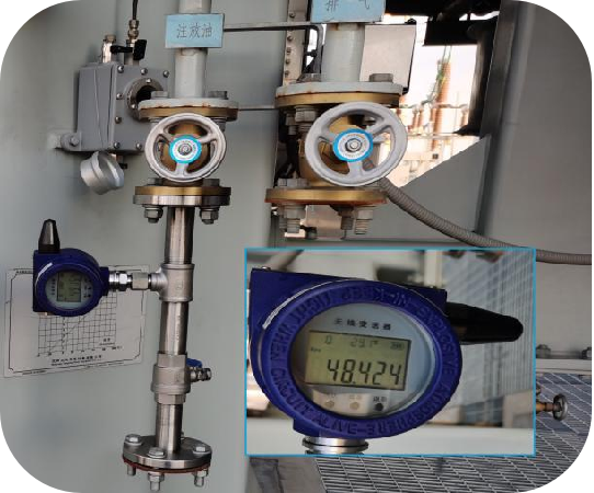 無線油壓在線監(jiān)測裝置安裝于儲油柜注放油管出口閥門處,用以監(jiān)測該位置油壓大小及油壓變化情況,根據(jù)該壓強值及油溫值可推算變壓器當(dāng)前實際油位,有效彌補傳統(tǒng)油位計因“假油位”(自身故障、膠囊破損、呼吸不暢等)導(dǎo)致油位無法準確監(jiān)測的短板,及時發(fā)現(xiàn)油位異常,避免因油位過低或緩慢漏油造成變壓器跳閘(雙浮球瓦斯繼電器)甚至絕緣損壞的問題,以及油位過高造成壓力釋放動作、變壓器跳閘的問題 。