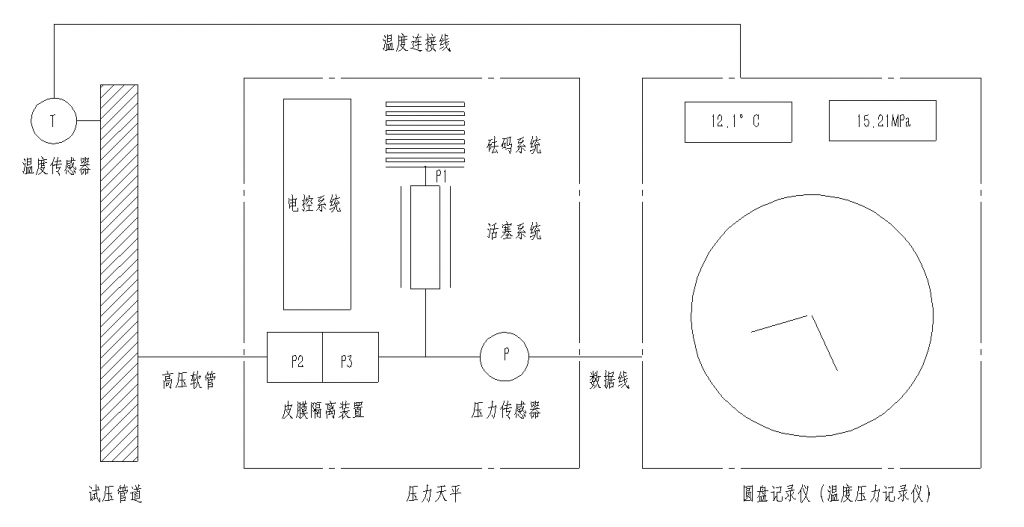 壓力天平相當(dāng)于液體天平,一邊是砝碼重力所產(chǎn)生的壓力,一邊是液體管道內(nèi)的壓力,當(dāng)這二個壓力相等時二者是平衡的(檢測管道內(nèi)壓力具體值,砝碼值之和即為管道內(nèi)壓力值),當(dāng)管道出現(xiàn)微泄這個平衡就會被打斷(檢測管道是否存在微泄)。
