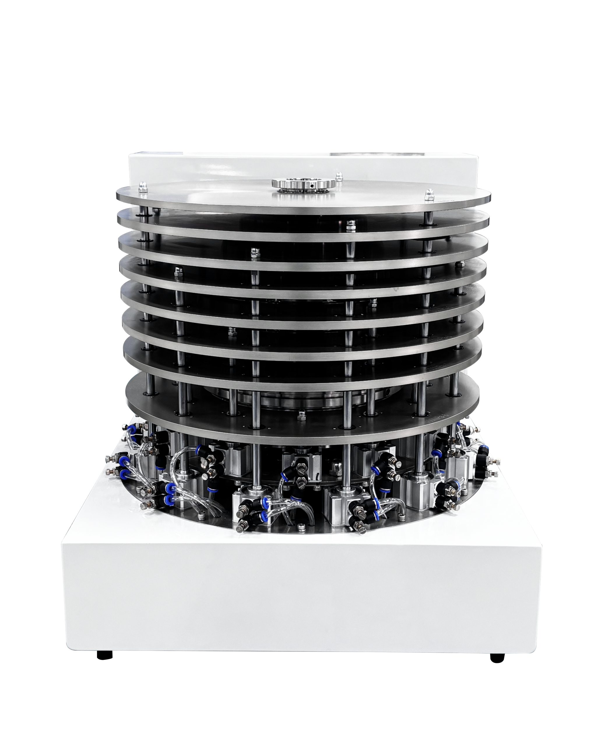 采用氣動(dòng)驅(qū)動(dòng),為每個(gè)砝碼(T型同心砝碼)配備獨(dú)立的氣缸與電磁閥組合,驅(qū)動(dòng)裝置行程為5毫米當(dāng)接收到指令以后,同步調(diào)整所有砝碼的狀態(tài)可快速同步的增減砝碼,且增減砝碼速度砝碼加載時(shí)間≤5s,提高加載/卸載砝碼組合的整體效率。